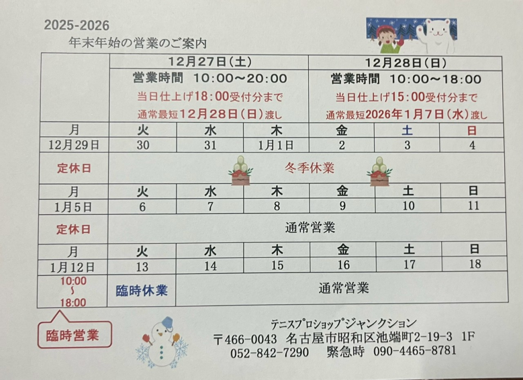 閉店後でもガット張りのご注文を受付けております。店頭に設置したラケットポストをご利用ください。正面看板を内容を読み、ポストのシャッター側に設置したボックスにある伝票に必要事項を記入してください。